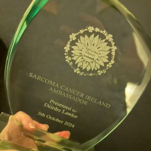 Our first sarcoma ambassador award was presented to Deirdre Lawlor, Deirdre became the first sarcoma cancer Ireland ambassador. Deirdre was a founding member and board member until Sept 2024. Her valuable insight into the charities sector was a guiding hand in our set up stages, We genuinely wouldn’t be were we are without her help. We felt that Deirdre was the perfect person to become our first ambassador.